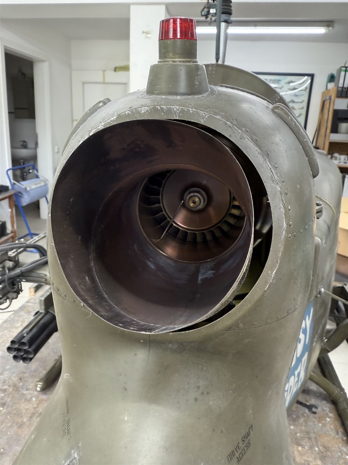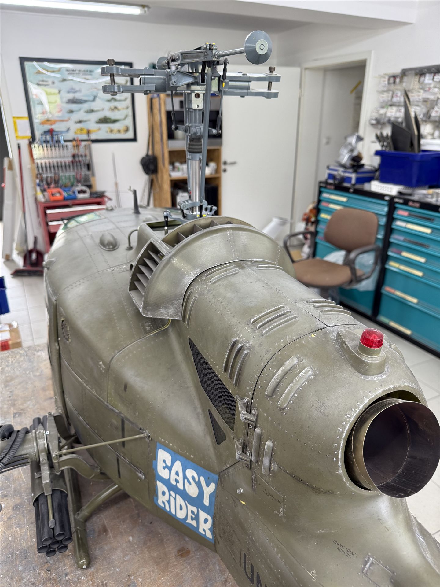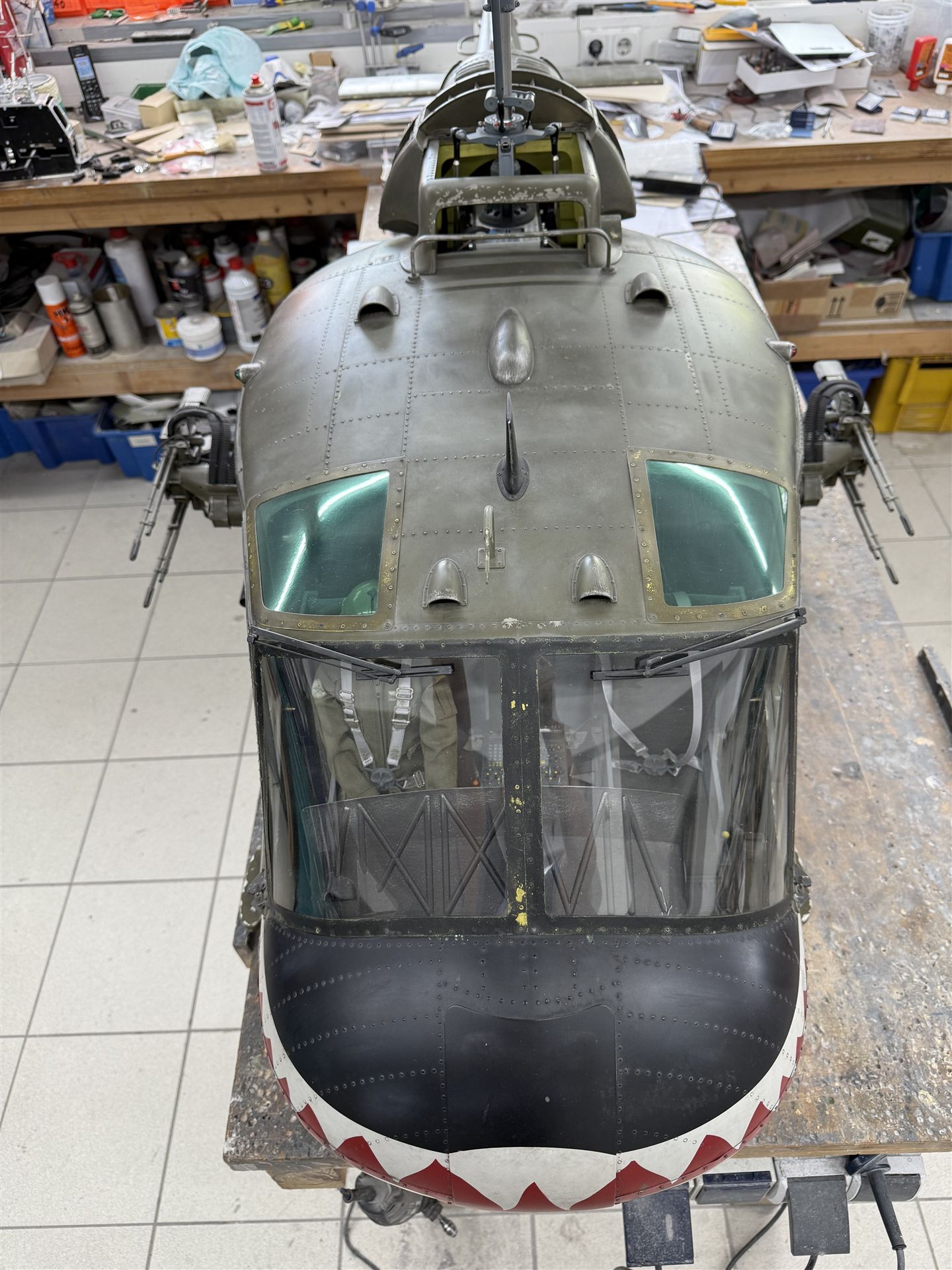 Die Verkleidung des Turbinen-Getriebe- Bereiches wird mit Verschluss Nachbildungen bestückt. Diverse Lufteinlässe auf und an der Verkleidung runden den super-scale Nachbau ab.